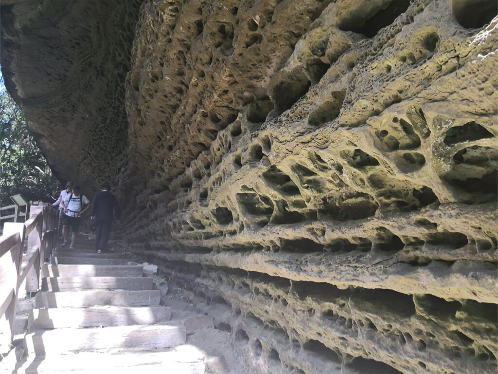 再往前走約100公尺,即可見到蝙蝠洞,蝙蝠洞的岩壁是燕子崖上部地層的延伸,綿延200多公尺,上面佈滿大大小小蜂窩狀的洞穴,早年這裡棲息著許多蝙蝠故以此命名。老實說,石壁上的洞穴若是太靠近看,可能會讓人引發密集恐懼症,所以還是保持點距離欣賞就好。