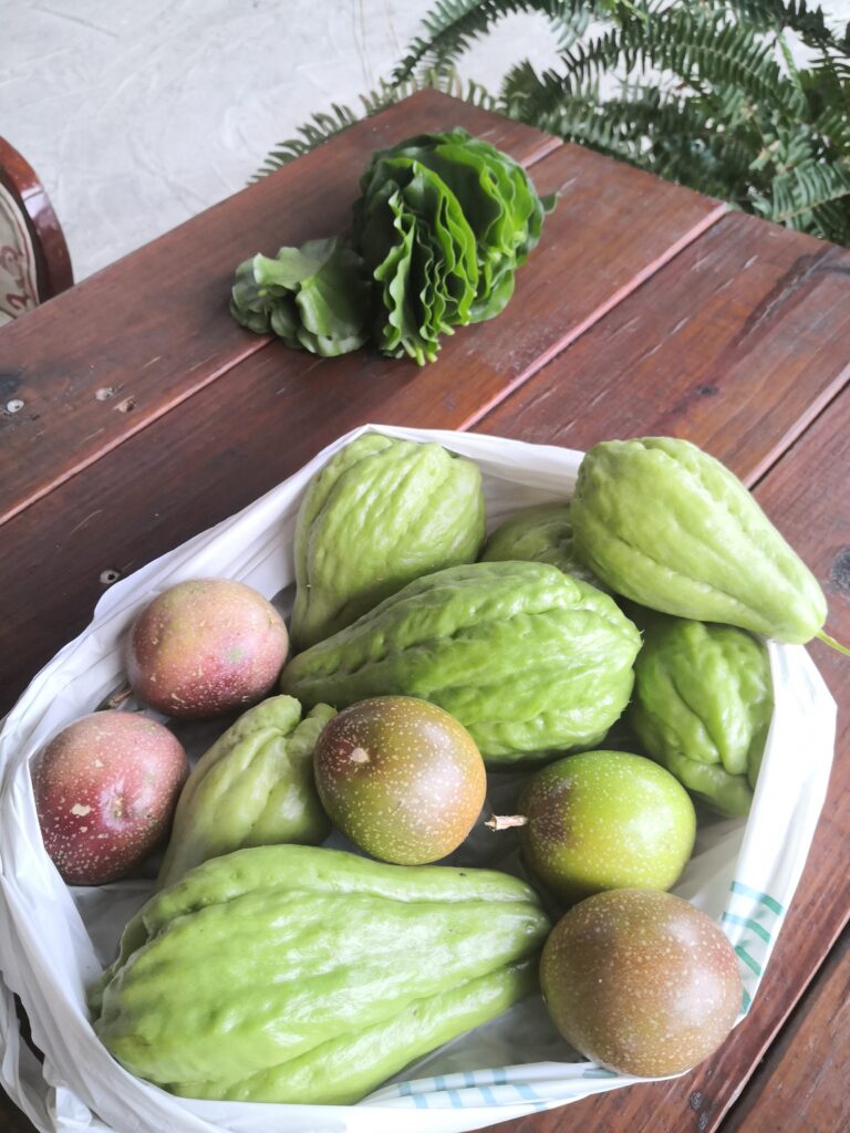 回到民宿,正巧碰見剛從外面回來的民宿老闆,老闆說明天開始他要出門好幾天,沒有時間採收他種的作物,見我們一群人正閒得慌,就把大家都帶去幫忙採果,當然這些採收下來的果實,老闆也大方的送給我們,大伙採了滿滿一袋的瓠瓜、百香果、川七,還現採現吃了一顆熟到開裂的火龍果,還未消化完畢的下午茶又加上現採的鮮甜水果,飽腹程度簡直爆表啊。