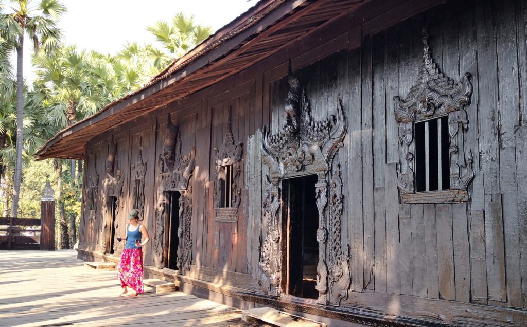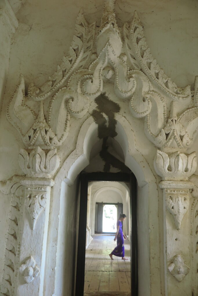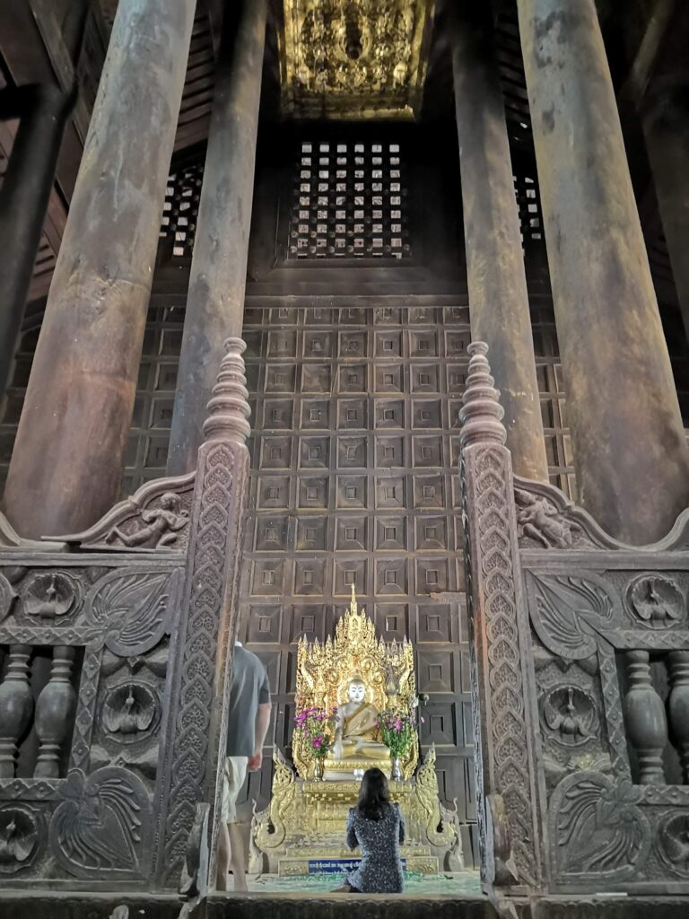 車子在一棟柚木建築前停下,我脫下鞋子循階而上,這是一座由五層簷頂構建的柚木僧院,一旁豎立著由七層尖頂組成的佛殿,走進僧院內頓時覺得光線昏暗,需要一些時間讓眼睛適應,僧院由 267 根柚木柱建造而成,結構巨大,仰首而望,更可感受其恢宏頂立的氣勢,過去這裡是皇室子女接受教育的地方,時至今日,室內也擺放著幾排課桌椅讓小僧侶學習,柚木寺建於貢榜王朝Bodawpaya王時期,1821 年一場大火燒毀了這棟僧院,1992年由政府仿照舊寺重建,供佛像和藏經使用。