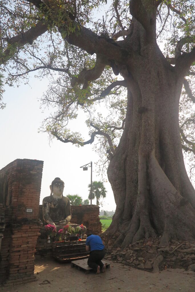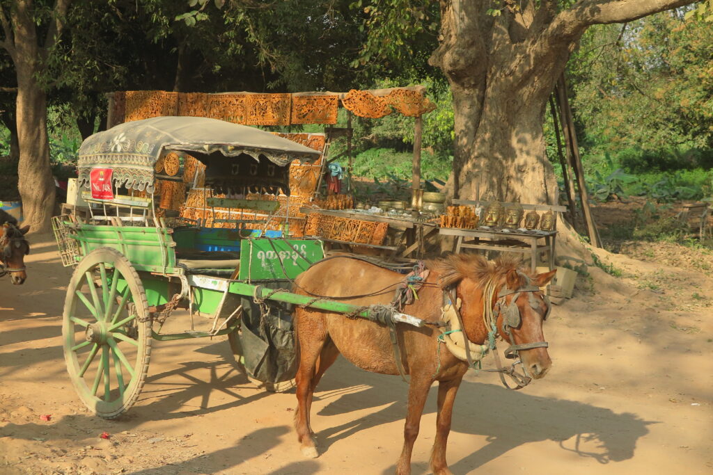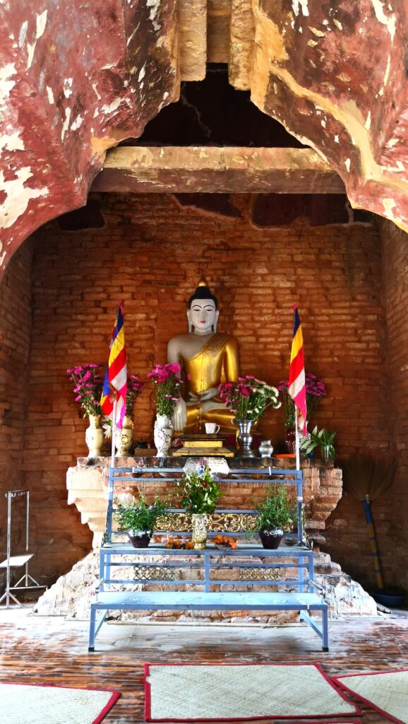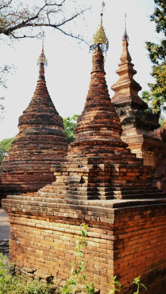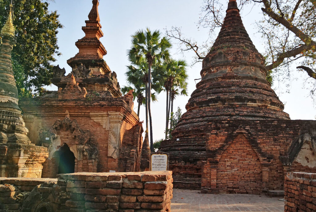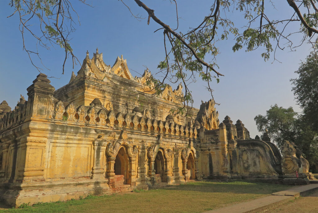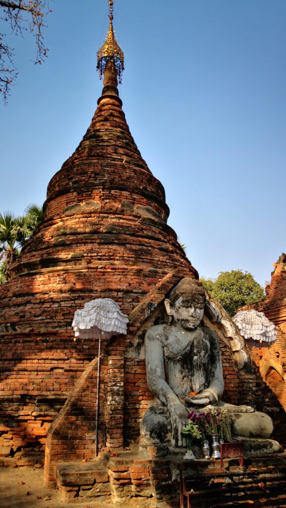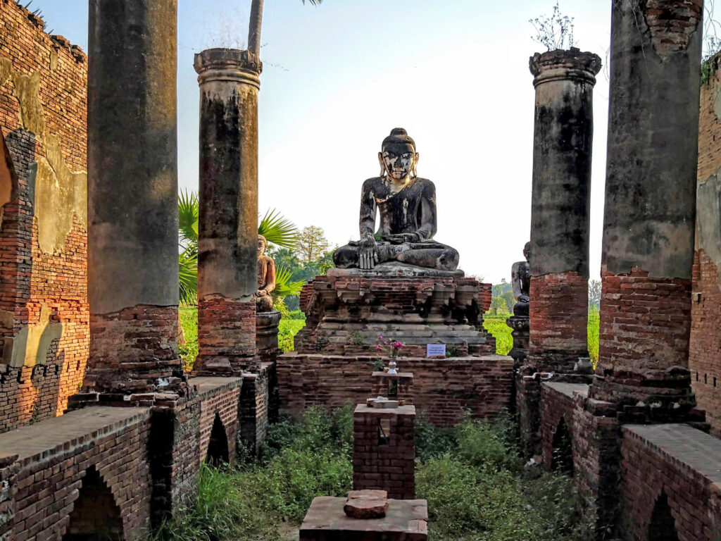 阿瓦古城因1839年一場地震而毀滅殆盡,災區的佛塔大量倒塌,磚構建築幾乎無一倖存,目前在古城區內所見的地上建物,不是後續重建修復的,就是地震後殘存的廢墟,位於一片田園中的雅達娜欣敏塔是此區遺留下來的佛塔群,佛塔週遭只餘磚牆基座和幾尊佛像,午後的斜陽從樹梢間灑下,緬甸人對著佛像頂禮膜拜,牆邊一名畫師蹲在地上寫生,地上擺放著他的作品供旅人選購,這裡沒有城市裡的喧鬧紛雜,時光漫漫,王朝的風華已褪去,只留下百年前的古佛繼續照看著這土地上的人們。