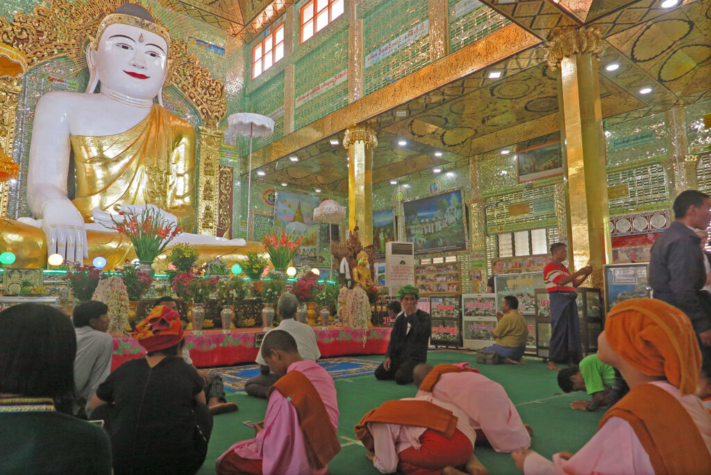 相傳寶塔供奉著兩顆佛祖的牙齒舍利,佛殿內牆鑲滿著翠綠的玻璃磁磚,柱子則貼上金箔裝飾,而佛殿中央立著一座高約5米的巨型坐佛,白色的佛身披著金色袈裟,慈眉善目的俯視著來此參拜的眾生,有趣的是,佛像兩側的守護動物,一側是蟾蜍一側是兔子,不知是何佛教典故。沿著佛殿外的走廊散步一圈,風徐徐而來,在此可以眺望伊洛瓦底江及曼德勒市的風景,讓人心曠神怡。